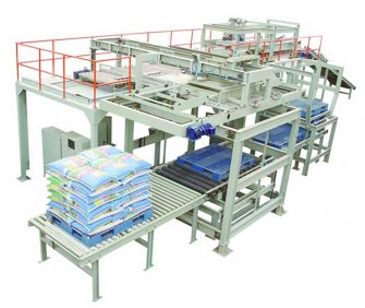 高位碼垛機可自動將包裝袋進行壓平、轉袋、分層編組;低位碼垛機采用PLC控制,通過觸摸屏進行垛層設計操作實現(xiàn)人機對話,可顯示生產(chǎn)速度故障原因及位置